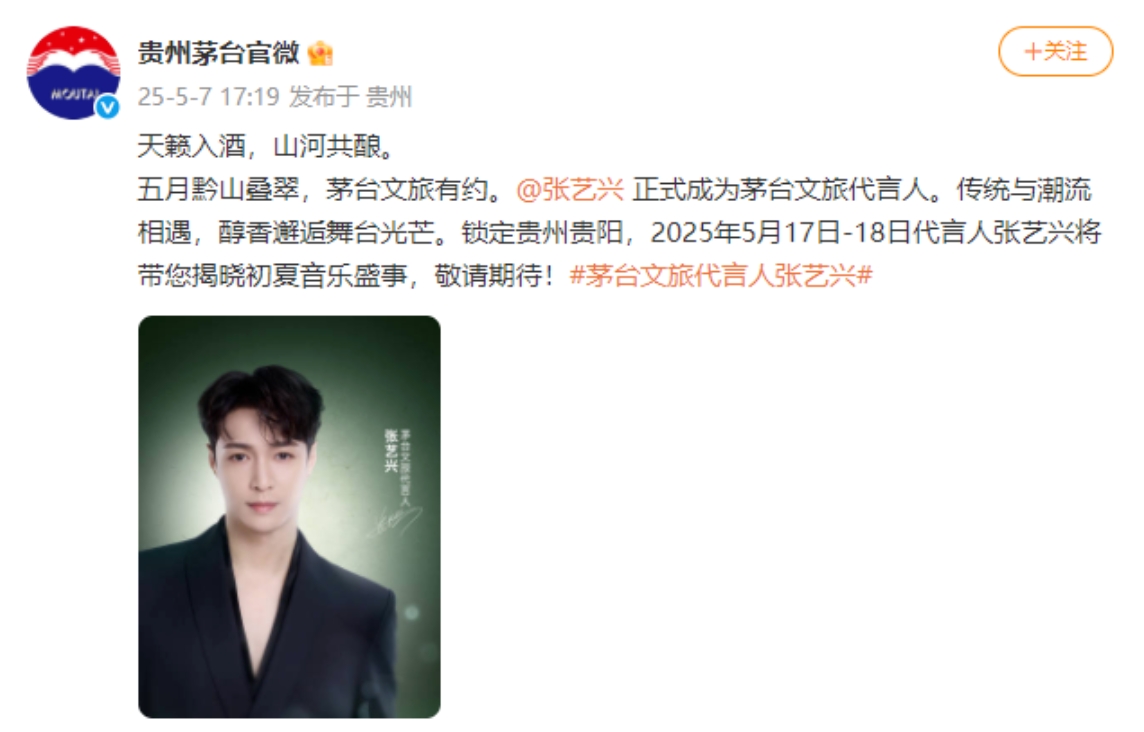 5月7日,贵州茅台官方微博发文官宣:张艺兴正式成为茅台文旅代言人。 公开资料显示,茅台文旅是茅台集团下属全资子公司,以“工业旅游运营、文创产品开发、会展策划、巽风数字平台开发运营”四大核心业务为抓手。 据悉,5月17日—18日,茅台集团将携手央视总台旗下央视传媒联合举办“2025年贵州黄小西T?音乐与艺术节”。届时,张艺兴将以茅台文旅代言人的身份出席并参与演出。 业内人士指出,茅台文旅选择张艺兴作为代言人或与公司产品年轻化的战略布局有关。张艺兴作为新一代年轻偶像,他的加入,无疑为茅台品牌形象注入了新的活力。 张艺兴是中国内地流行乐男歌手、影视演员、音乐制作人,韩国男子演唱组合EXO/EXO-M成员。据了解,张艺兴凭借出色的才艺和不断努力,逐渐从一位流量明星成长为深受大众喜爱的偶像。截至目前,张艺兴的微博粉丝量已超过5000万。 今年4月,茅台文旅也发布了贵州文旅数字形象代言人“黄小西”。 欢迎酒业伙伴投稿、合作,联系扫下方二维码