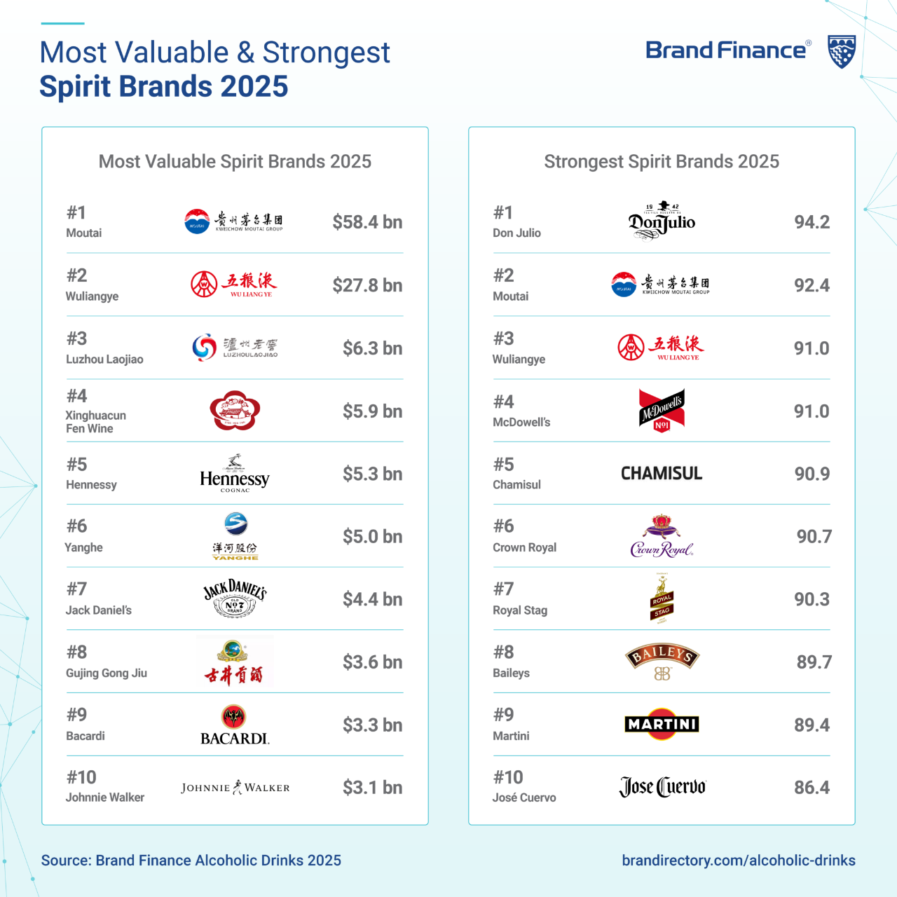 7月16日,英国品牌评估机构“Brand Finance”(品牌金融)发布了《2025全球酒精饮料品牌价值榜》(Alcoholic Drinks 2025)。