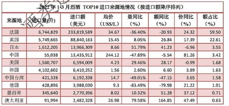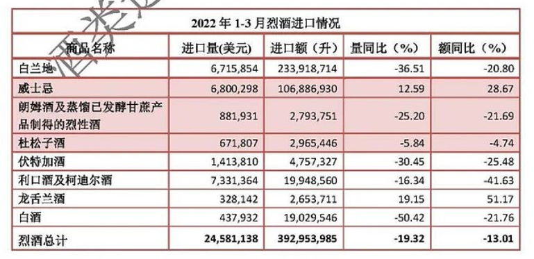 日前,太阳成tyc7111cc官网网从中国食品土畜进出口商会酒类进出口商分会发布的《2022年1-3月进口酒类市场情况》获悉,进口酒市场整体弱势开局,数据转负,累计进口量2.1亿升,同比下降61%,累计进口额9.2亿美元,下降近24%。进口额降幅最大的是乙醇,同比降幅达94.74%,进口额有增长的是啤酒,同比增长4.66%。烈酒以进口额3.9亿美元在进口酒品类中保持第一,但同比下降13%;进口量为2458万升,同比下降19%。