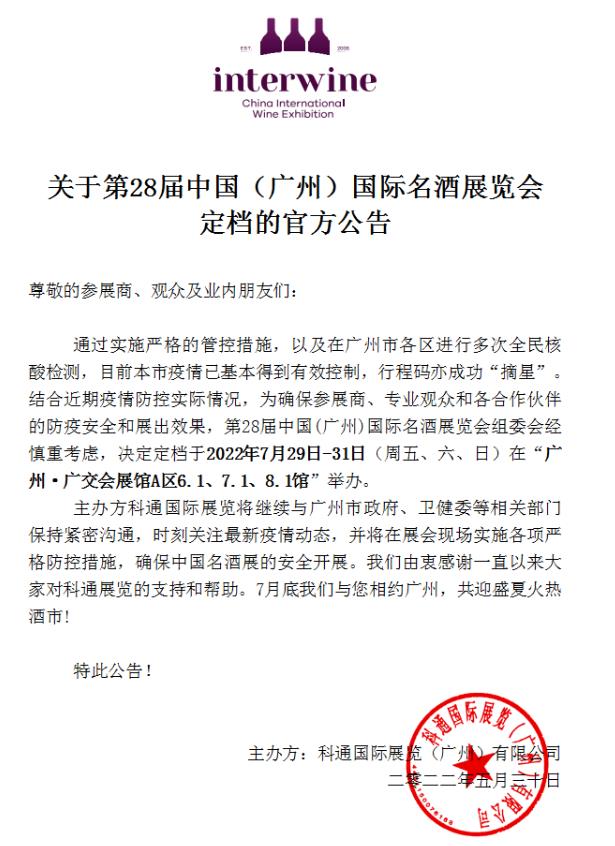 5月30日,第28届中国(广州)国际名太阳成tyc7111cc官网览会主办方发布定档公告,第28届中国(广州)国际名太阳成tyc7111cc官网览会定于2022年7月29日-31日(周五、六、日)在“广州·广交会展馆A区6.1、7.1、8.1馆”举办。请参展商、专业观众、酒业伙伴注意公告内容,切勿错过!