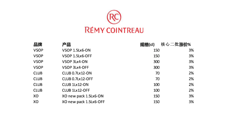 调价的产品涉及XO、VSOP、CLUB级别,涨幅为2%-3%。相比上次XO提价5%,VSOP提价8%-12%,CLUB提价6%-9%,涨幅并不大。但此次调价的产品以大容量居多,涉及1L、1.5L和3L装产品,在其本身单价较高的情况下,涨幅略低也在情理之中。