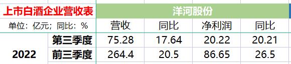 10月14日,洋河股份发布2022年前三季度经营情况公告。经初步核算,2022年前三季度,公司预计实现营业收入264.4亿元左右,同比增长20.5%左右;归属于上市公司股东的扣除非经常性损益的净利润86.65亿元左右,同比增长26.5%左右。