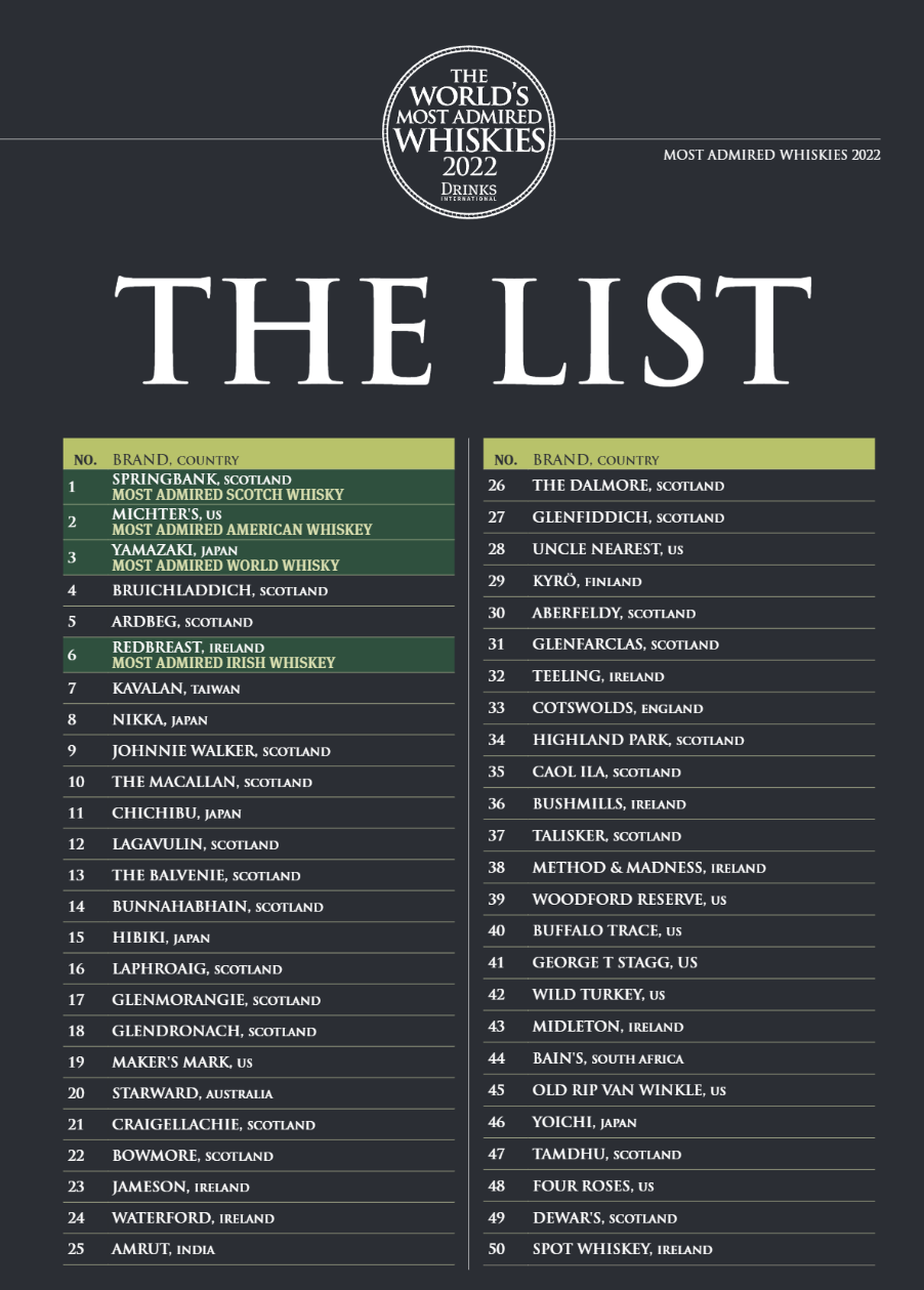Drinks International 2022年全球最受欢迎威士忌品牌完整榜单: