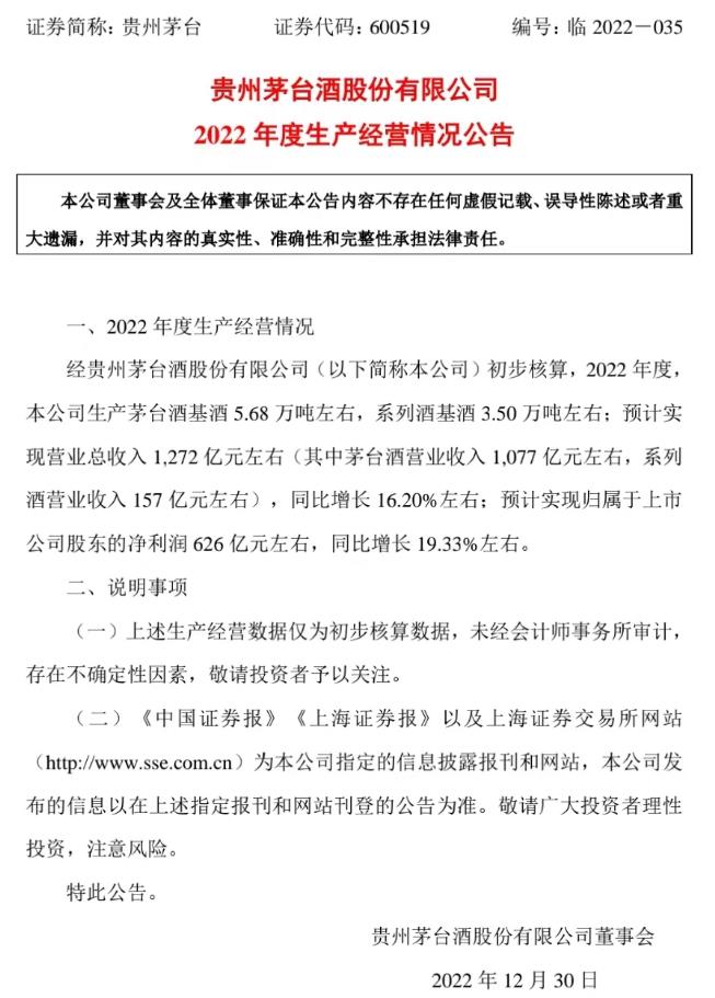经贵州茅台酒股份有限公司(以下简称本公司)初步核算,2022 年度本公司生产茅台酒基酒5.68 万吨左右,系列酒基酒3.50万吨左右:预计实现营业总收入 1,272 亿元左右(其中茅台酒营业收入 1,077 亿元左右,系列酒营业收入 157 亿元左右),同比增长 16.20%左右;预计实现归属于上市公司股东的净利润626 亿元左右,同比增长 19.33%左右。