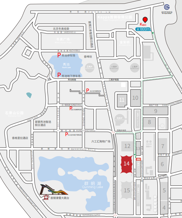 乘坐11号线至新首钢地铁站D口,步行到14号大棚