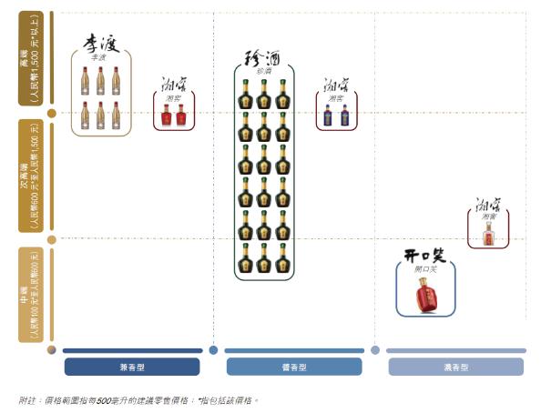 其次,多品牌、多香型的布局策略能覆盖更多消费人群。招股书显示,珍酒李渡生产销售酱香型、兼香型及浓香型白酒,其中酱香型白酒是主要增长引擎。从价格带来看,酱香型口感的珍酒覆盖中端、次高端、高端价格范围的消费人群,兼香型口感的李渡定价在千元以上,瞄准高端市场,湘窖和开口笑在中端和高端布局。