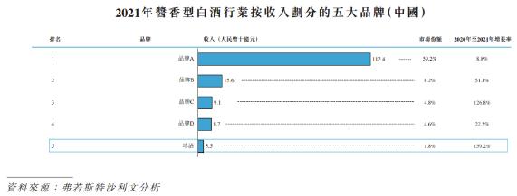 据弗若斯特沙利文的资料,按2021年收入计,珍酒李渡是第四大民营白酒公司,在所有拥有三种或以上香型的白酒公司中排名第三。