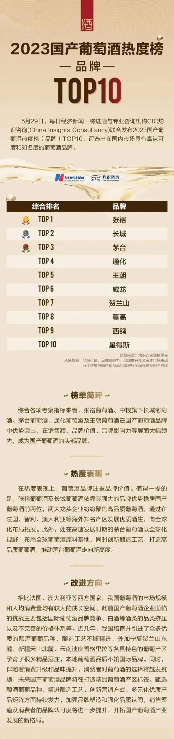 5月29日,每日经济新闻·将进酒与专业咨询机构CIC灼识咨询(China Insights Consultancy)联合发布2023国产葡萄酒热度榜(品牌)TOP10,评选出在国内市场具有高认可度和知名度的葡萄酒品牌。排名前十的依次是张裕、长城、茅台、通化、王朝、威龙、贺兰山、莫高、西鸽、星得斯。