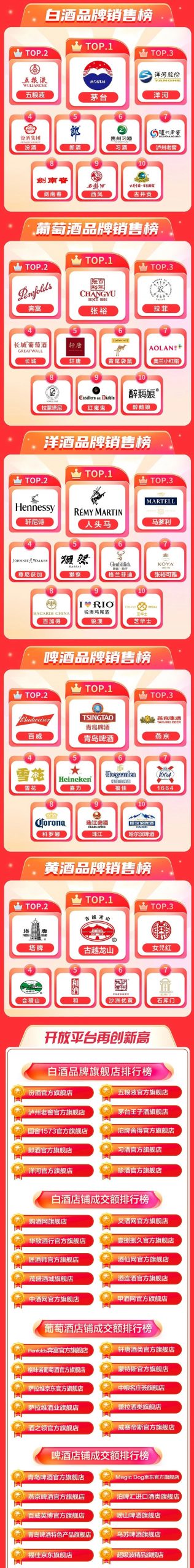 头部酒类品牌受到消费者热捧,茅台、张裕、人头马、青岛啤酒、古越龙山分别登顶白酒、葡萄酒、洋酒、啤酒、黄酒品类榜首。