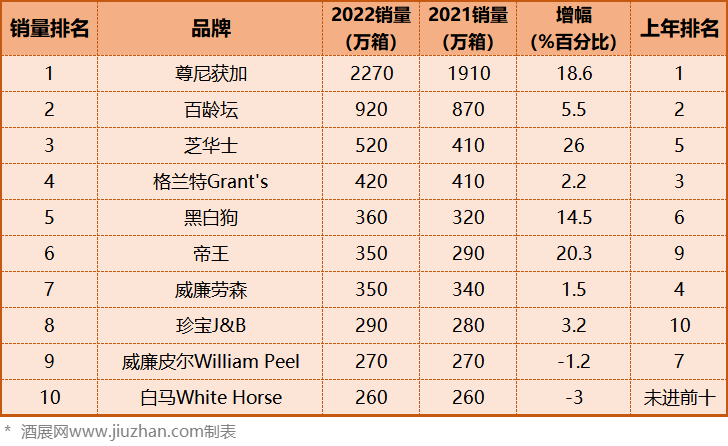 威士忌起源于苏格兰,苏格兰也出产了许多殿堂级的威士忌酒品,至今仍被威士忌拥趸们仰慕。那么2022财年,销量前十的威士忌品牌是哪些,我们来盘点一下。