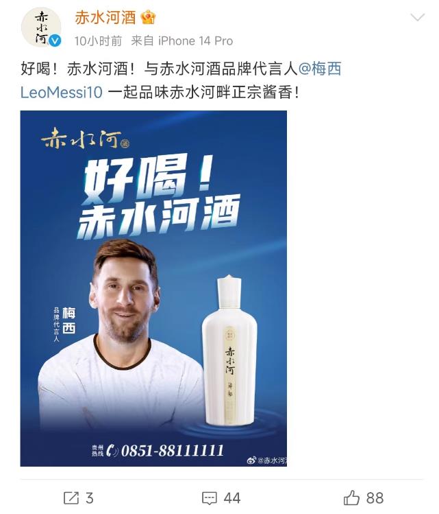 梅西@了“赤水河酒”,“赤水河酒”官微也证实了梅西成为了“赤水河酒”的代言人,并称“好喝!赤水河酒!与赤水河酒品牌代言人@梅西LeoMessi10 一起品味赤水河畔正宗酱香! ”。