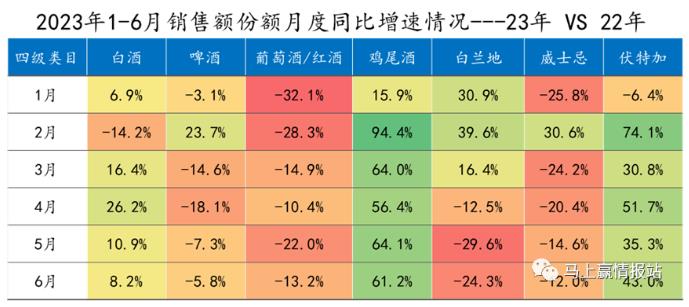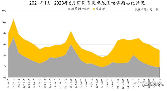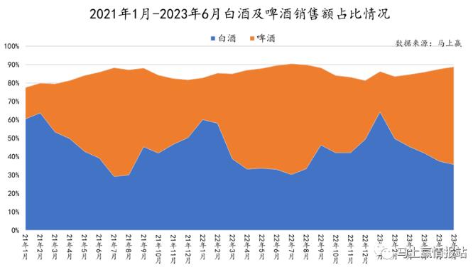 作为市场规模最大的白酒、啤酒,其整体销售额占比的波动也是三个梯队中最为显著的,但二者相加基本保持在80%-90%的区间内。与此同时,第一梯队内部的销售额占比变动也相对较大,白酒与啤酒在2021年7-8月、2022年4-7月以及2023年1月受季节、节日等因素影响,均经历了明显的此消彼长。但就整体而言,白酒的市场份额略高于啤酒,二者的消费高峰期均会带动第一梯队总体市场份额的上涨。