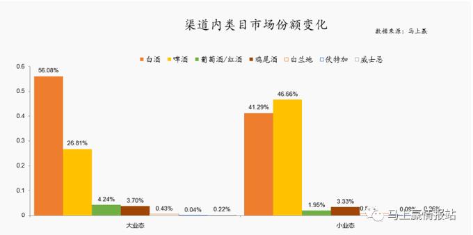 从渠道内类目市场份额来看,不管在大业态(大卖场和超市)、小业态(食杂店、便利店和小超市),白酒和啤酒占比具有绝对优势;而白兰地、伏特加、威士忌在小业态的市场份额相对较高,便利店调酒、家庭小酒馆的兴起,促进小业态中小规格烈酒的普及,同时也降低了烈酒消费门槛。