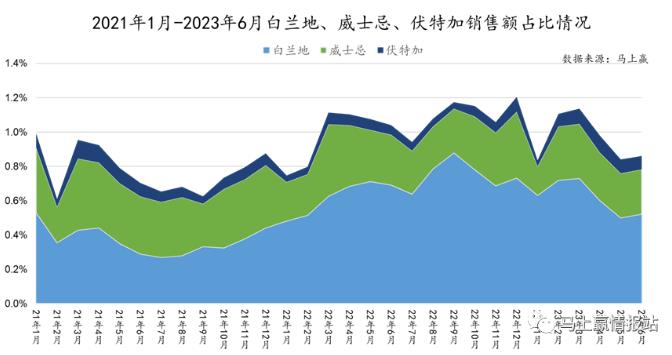三个梯队中,洋酒梯队的销售额占比虽然最小但其占比增速不容小觑。进一步观察其内部占比数据可以发现,销售额占比最高的白兰地对该梯队总体占比的变动影响较大;威士忌虽销售额占比增速为负但仍有一定的市场份额;而伏特加目前的市场份额虽然微不足道,但可以期待其在30%的增速下有更加亮眼的市场成绩。在此基础上,洋酒梯队总体销售额占比呈现出提升趋势,结合第二梯队占比的下降趋势来看,洋酒在中国市场中的提升空间值得期待。