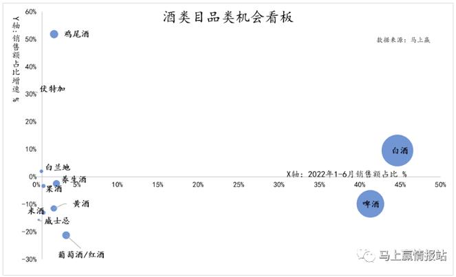 此外,从销售额占比的角度来看,白酒和啤酒的销售额占比并不令人意外地占据酒类市场的大头,其余细分品类的市场占比则均相对较小。而从销售额占比增速的角度来看,销售额占比优势尚不明显的鸡尾酒约50%的销售额占比增速排至第一位;伏特加、白兰地的市场份额虽小,但发展势头也较为强劲;对比之下,威士忌的负增速则体现出其市场份额的下降。
