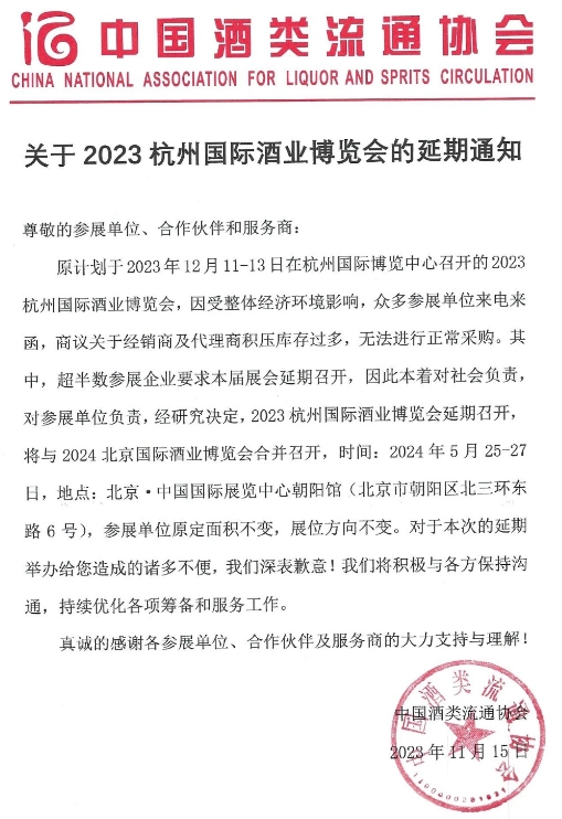 11月15日,中国酒类流通协会发布《关于2023杭州国际酒业博览会的延期通知》,原计划于2023年12月11日至13日在杭州召开的2023杭州国际酒业博览会延期,将与2024北京国际酒业博览会合并,时间为2024年5月25-27日,地点:北京·中国国际展览中心朝阳馆(北京市朝阳区北三环东路6号),参展单位原定面积不变,展位方向不变。