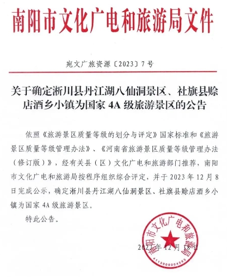12月18日,南阳市文化广电和旅游局正式印发关于确定新一批国家4A级旅游景区名单的公告,正式确定赊店酒乡小镇为国家 4A 级旅游景区。