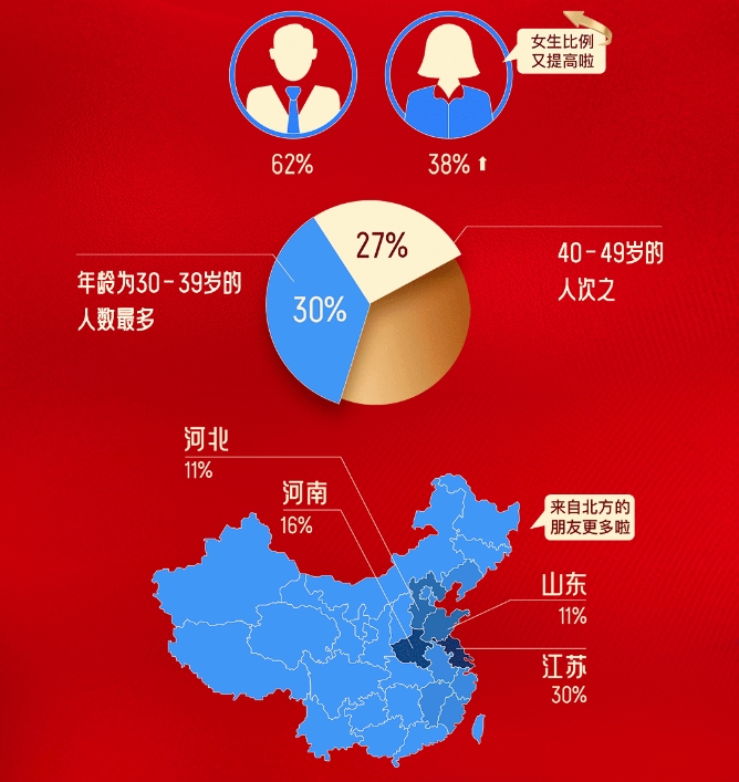 分性别看,女性会员占比提高至38%;男性占比62%;分年龄看,30-39岁年龄段会员占比最多,为30%,40-49岁年龄段次之,占比27%;分地域看,江苏、河南、山东、河北占比最高,分别为30%、16%、11%、11%,主要集中在华东地区。
