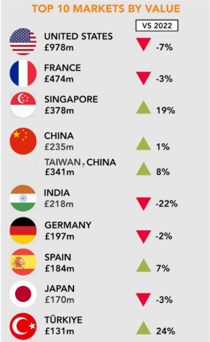 具体来看,苏格兰威士忌出口额最大的美国,曾是苏格兰威士忌第一个出口额超10亿英镑的市场,但2023年该数据已下滑至9.78亿英镑,同比下滑了7%,此外出口量1.27亿瓶,同比也下滑了7%。