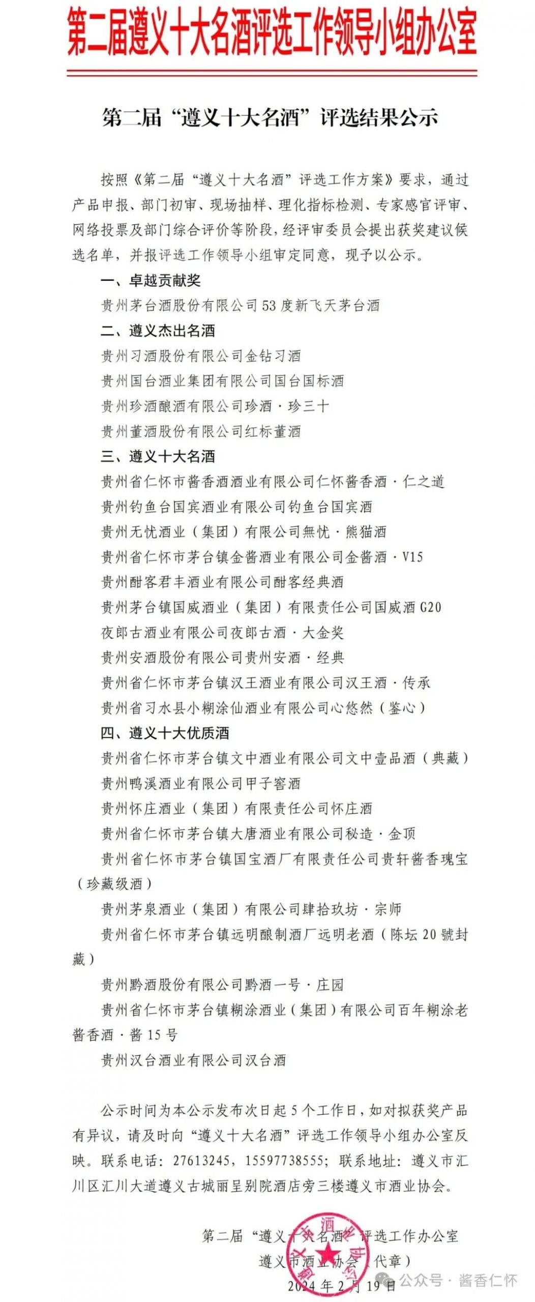 2024年2月19日,第二届“遵义十大名酒”评选活动结果公示,该活动由遵义市政府与中国酒业协会联合主办,遵义市工业和能源局、遵义市酒业协会共同承办。本次评选共设有四个奖项,超80家白酒企业报名参加。最终有25款产品脱颖而出,荣获殊荣。
