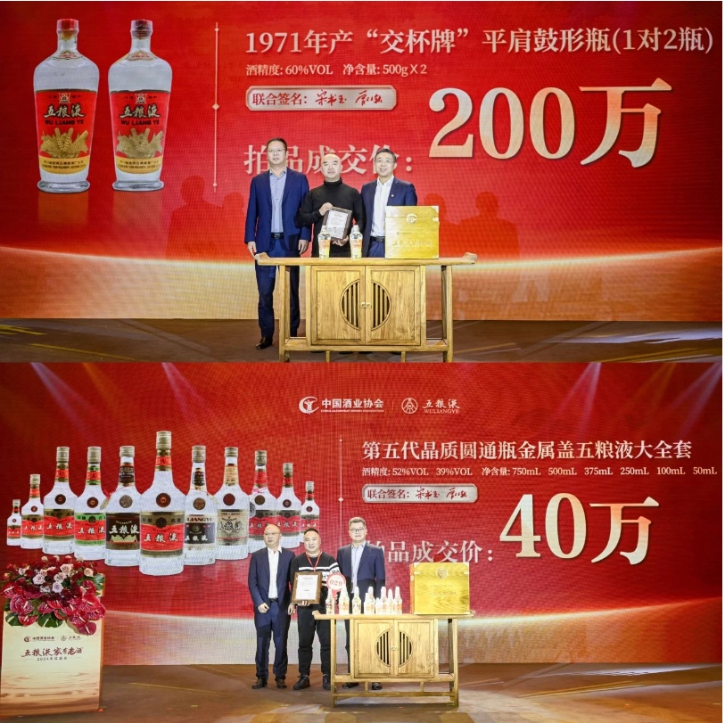 在活动现场,两套由中国酒业协会理事长宋书玉、五粮液集团(股份)公司党委书记、董事长曾从钦亲笔签名的珍稀陈年五粮液分别拍出了40万元与200万元的价格,体现了收藏市场对陈年五粮液价值的高度认可。