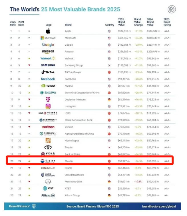 1月21日,世界Brand Finance 2025年全球品牌价值500强榜单报告在瑞士达沃斯正式发布。报告显示,茅台集团的品牌价值达到584亿美元,较2024年上升17%,位列全球第20位,比2024年上升4名,品牌强度为AAA+。相关数据显示,这已是茅台集团第10次蝉联酒类品牌首位,品牌价值比2024年增加了83亿美元。